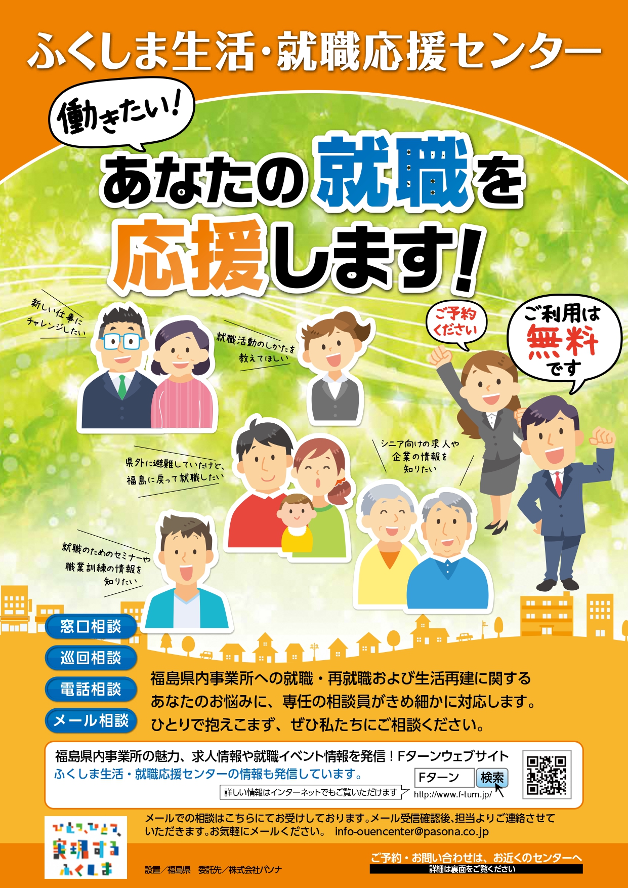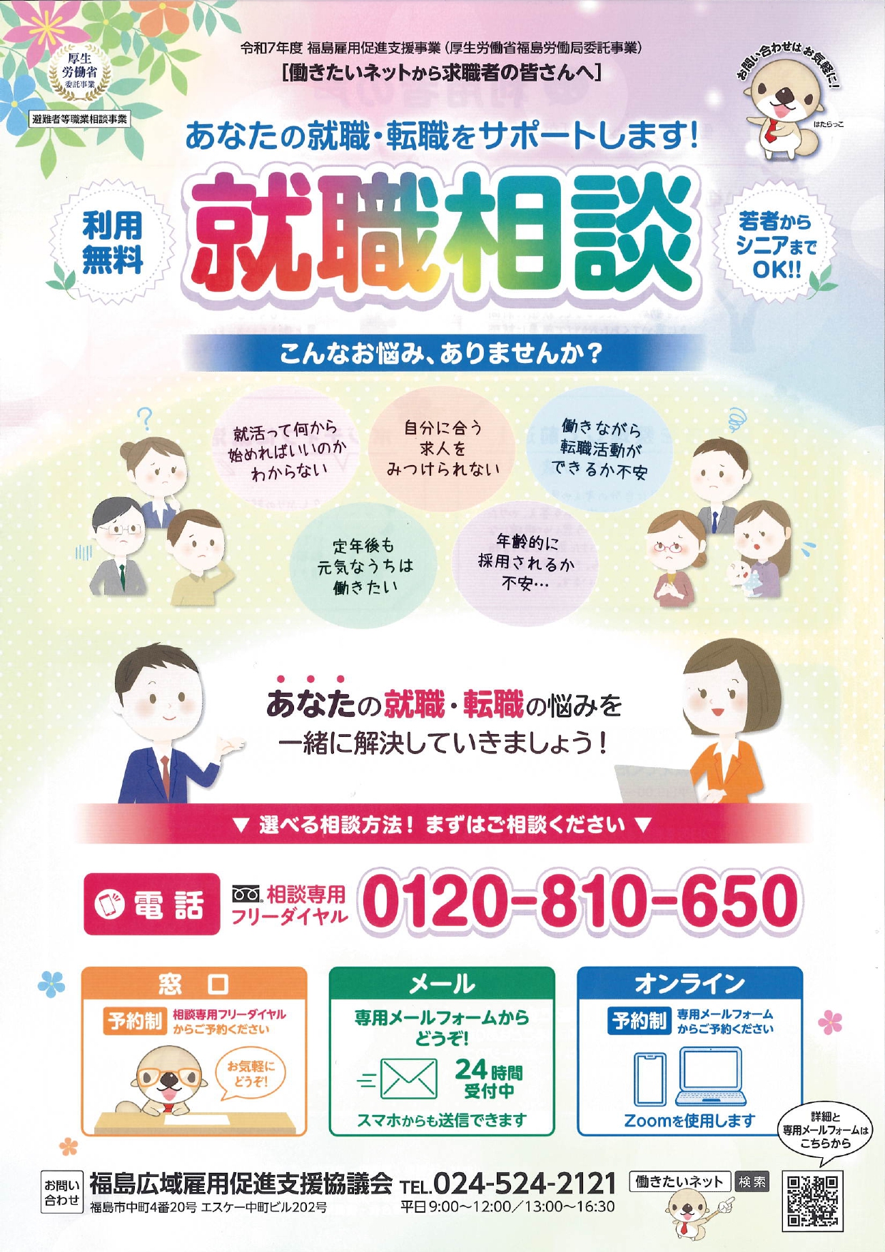 専任の相談員が、就職や生活再建に関する悩みや不安の相談に対応します。また、センターが独自に開拓した県内企業の求人情報の紹介、就職活動に役立つセミナー、イベント情報、職業訓練など最新の情報を提供してもらうことができます。