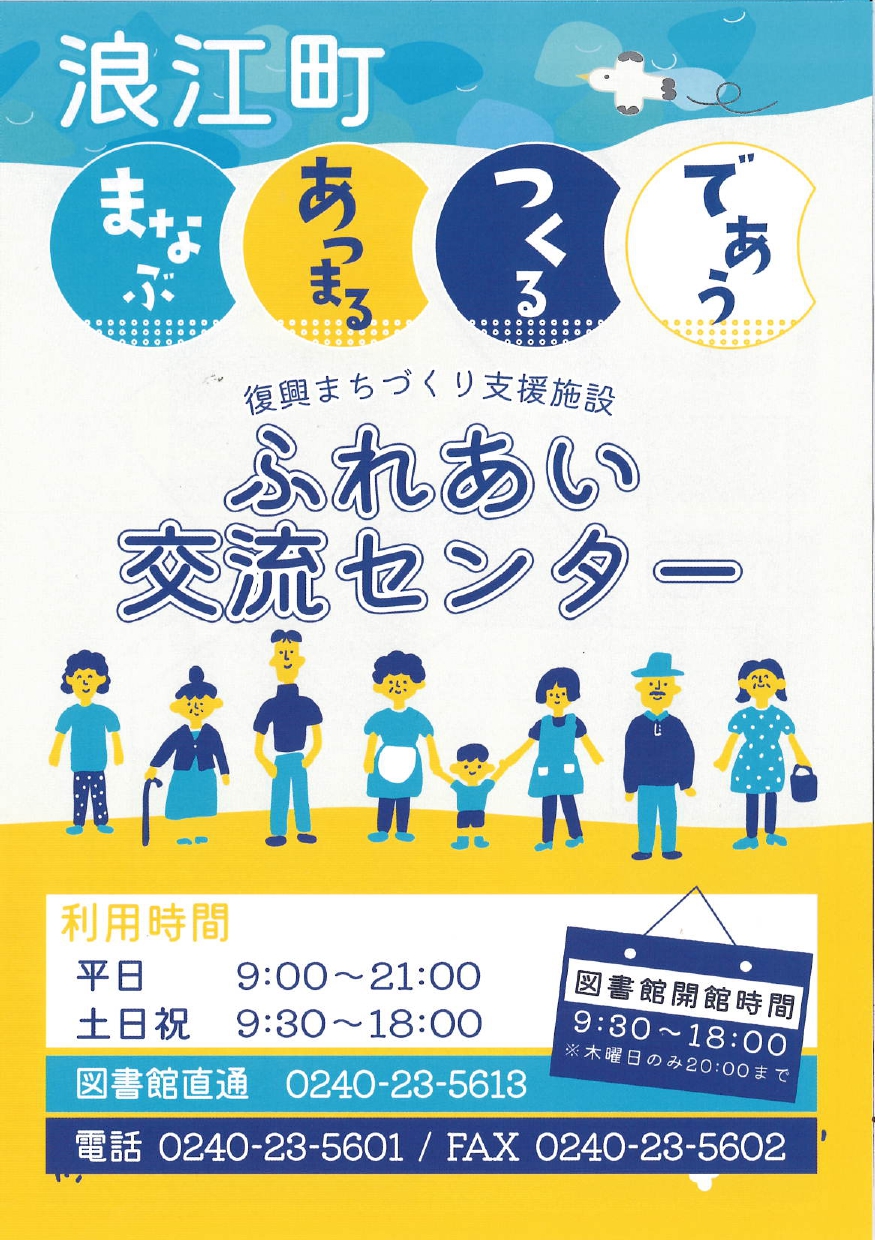 JR浪江駅西側にオープンした複合施設です。会議室や多目的ホールの他に、図書コーナーや調理室、展示・談話コーナーなどもあり、演奏会練習や調理実習など、他にも様々な目的でご利用できます! ぜひお立ちよりください!